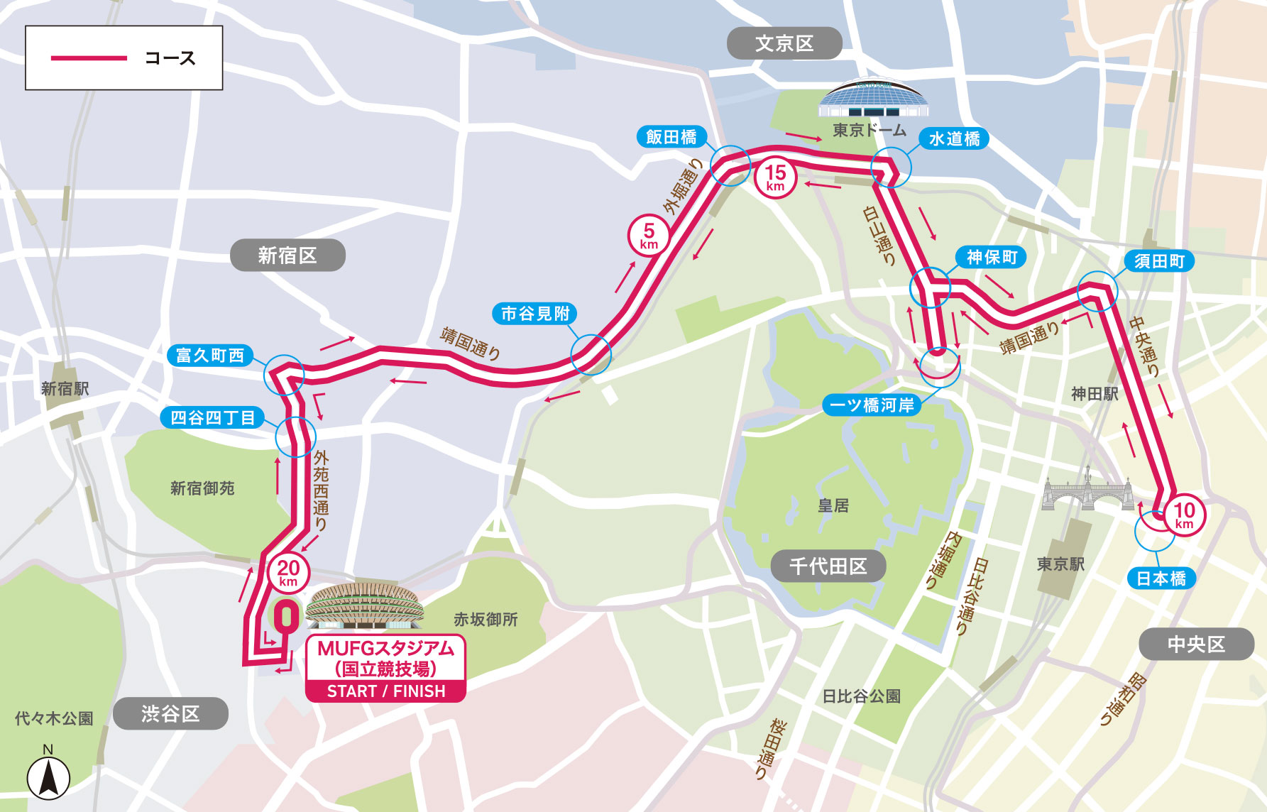 MUFGスタジアム(国立競技場)スタート~富久町~水道橋~神保町~神田~日本橋(第一折り返し)~神田~神保町~一ツ橋河岸(第二折り返し)~神保町~水道橋~富久町~MUFGスタジアム(国立競技場)フィニッシュ