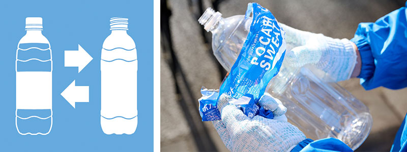 オフィシャルパートナーの大塚製薬株式会社と協働し、各給水所でランナーに提供する飲料のペットボトルを分別回収します。回収されたペットボトルは、再生ペットボトルの原料に処理・加工され、その原料を用いて製造されたペットボトルは、大塚製薬をはじめ飲料メーカーの飲料容器として再び利用されます。