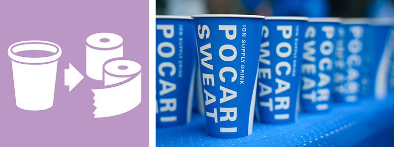 オフィシャルパートナーの大塚製薬株式会社と協働し、 紙コップのリサイクルを行います。ランナーに給水所で飲用した後に専用の回収ボックスに入れてもらい回収、 回収した紙コップは再生紙の原料として処理・加工され、トイレットペーパーに生まれ変わります。