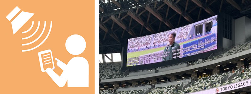 大会当日、国立競技場において、アナウンス内容を多言語字幕表示することができる「SoundUD」を活用します。 また、視聴覚障害間、多言語対応などさまざまなシーンでのコミュニケーションに対応するため、ボランティア活動向けにアプリ「UDトーク」の活用を推奨します。