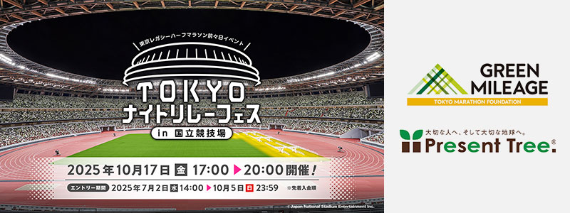大会前々日に行われる、TOKYO ナイトリレーフェスin 国立競技場では、参加する皆さまの総走行距離をマイル換算し、グリーンマイレージとして、60マイルごとにPresent Tree を通じて東京都檜原村へ1本の植樹を行います。