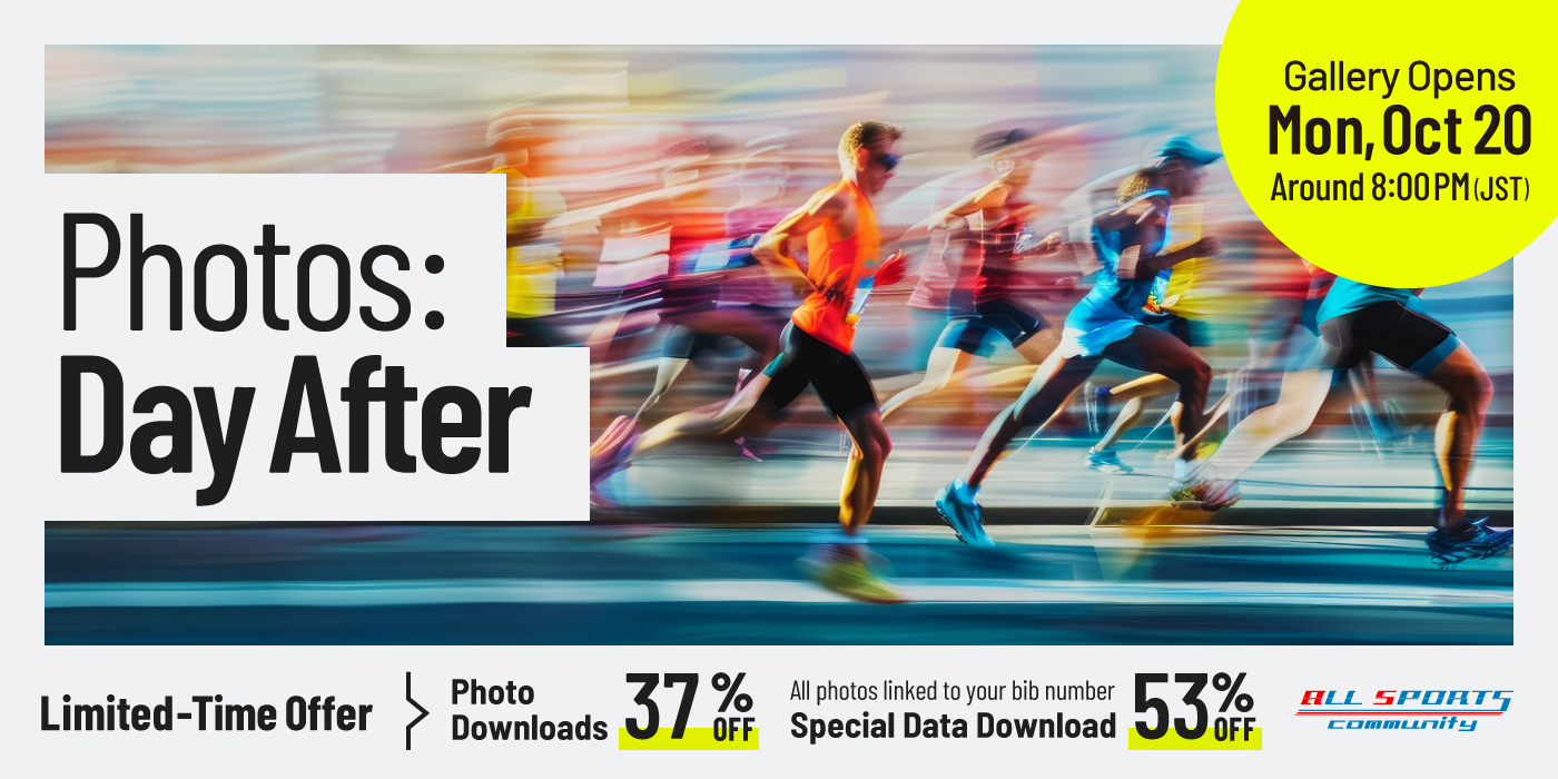 Gallery Opens : Mon, Oct 20 around 8:00 p.m. (JST) Your race day memories don't have to wait! ALL SPORTS Community is thrilled to announce a special project just for you: "Next-Day Photo Release" and "Special Pricing." View, share, and purchase your fantastic race photos right after the event. Find your moment!