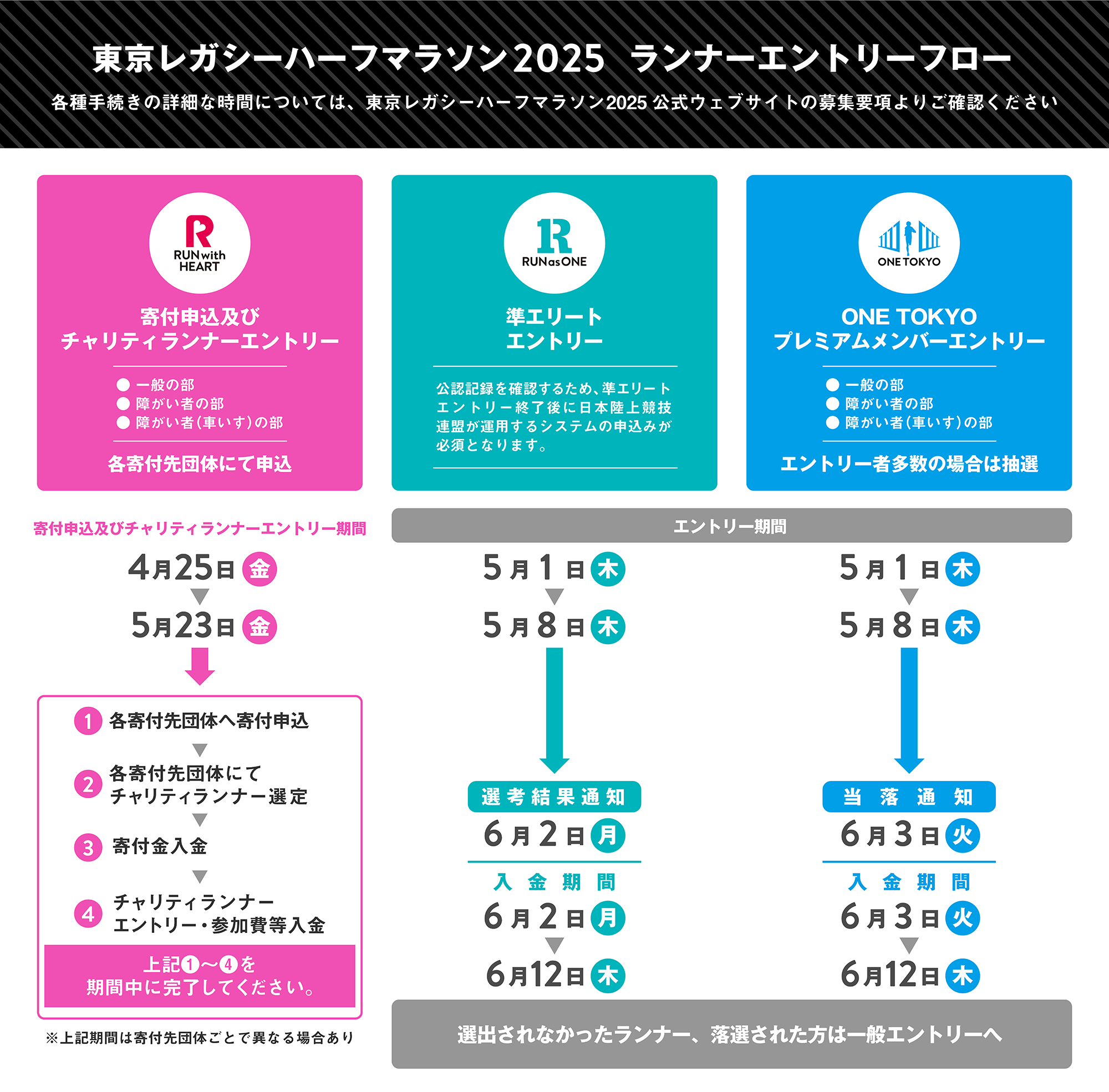 東京レガシーハーフマラソン2025の ランナー募集 について、お知らせします。 各エントリーのURLは ランナー募集ページ にてご確認ください。 ※なお、エントリーURLは、エントリー開始のタイミングで改めてお知らせします。