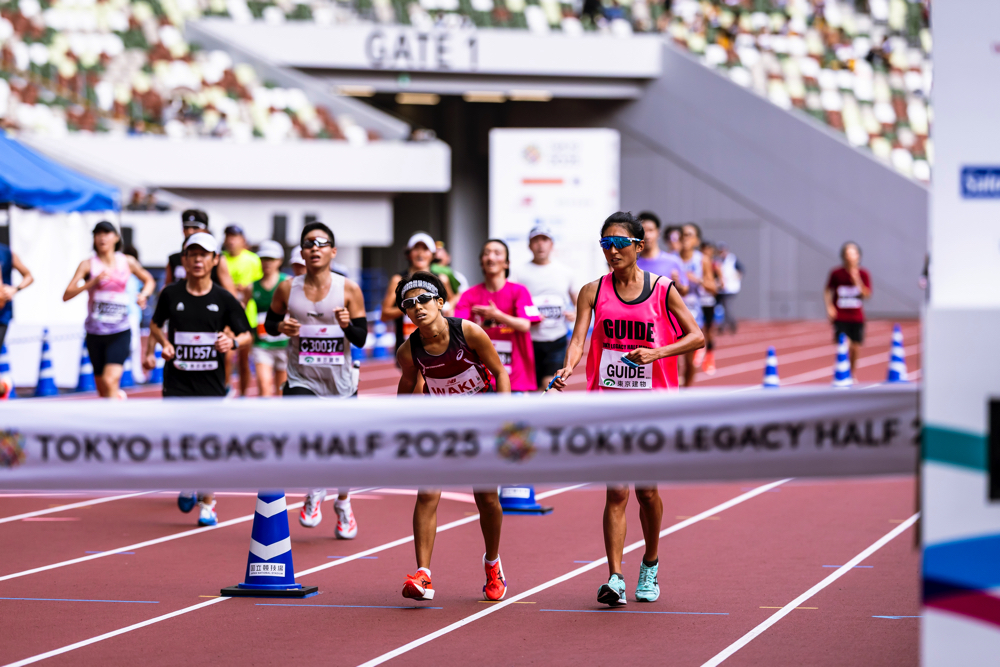 東京レガシーハーフマラソンでは、さまざまな障がいクラスのアスリートが参加しています。例えば、今大会には聴覚障がいT00クラス男子に青山拓朗(台東区陸協)が、同女子に安本真紀子(日本デフ陸上競技協会)が出場しました。ともに、今年11月に日本で初開催される東京2025デフリンピックのマラソンと10000m日本代表に決定しています。