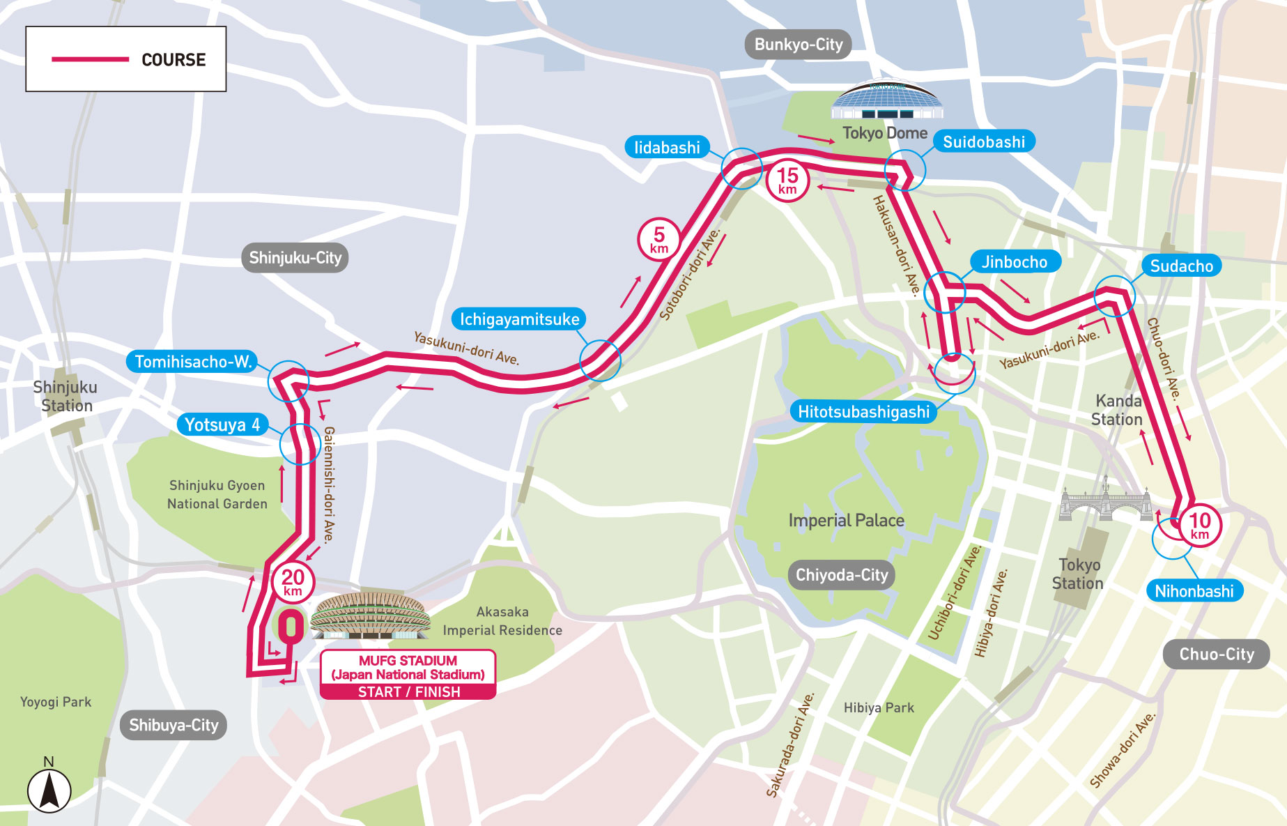 MUFG STADIUM (Japan National Stadium) (Start) -- Tomihisacho -- Suidobashi -- Jinbocho -- Kanda -- Nihonbashi(First turning point) -- Kanda -- Jinbocho -- Hitotsubashigashi(Second turning point) -- Jinbocho -- Suidobashi -- Tomihisacho -- MUFG STADIUM (Japan National Stadium) (Finish)