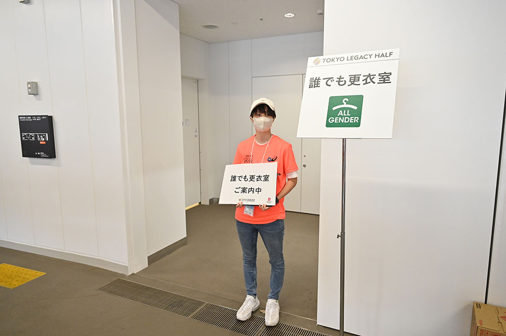 本大会では、LGBTQ+フレンドリーな大会運営を目指し、スポーツイベントにおけるダイバーシティ促進の協定を締結しているプライドハウス東京(運営:認定NPO法人グッド・エイジング・エールズ)に、スタート・フィニッシュ会場である国立競技場内に設置した誰でも更衣室の誘導や各種制作物への助言など、LGBTQ+の観点で大会運営をサポートしていただきました。
