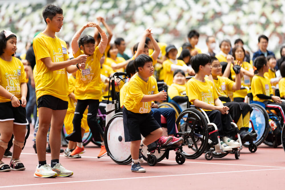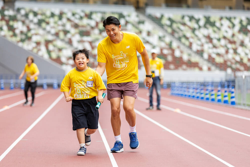 知的障がいのある方をはじめ、障がいの有無にかかわらず、誰もが参加できるインクルーシブなプログラムの「チャレンジ陸上教室」は今年も、ヤマダホールディングス陸上競技部の皆さんがコーチを務めました。参加者は2つのグループに分かれ、東京2020オリンピック日本代表の安部孝駿さんらの指導のもと、動き作りに励み、仲間たちと競い合ったりしながら、「かけっこの楽しさ」を体験しました。